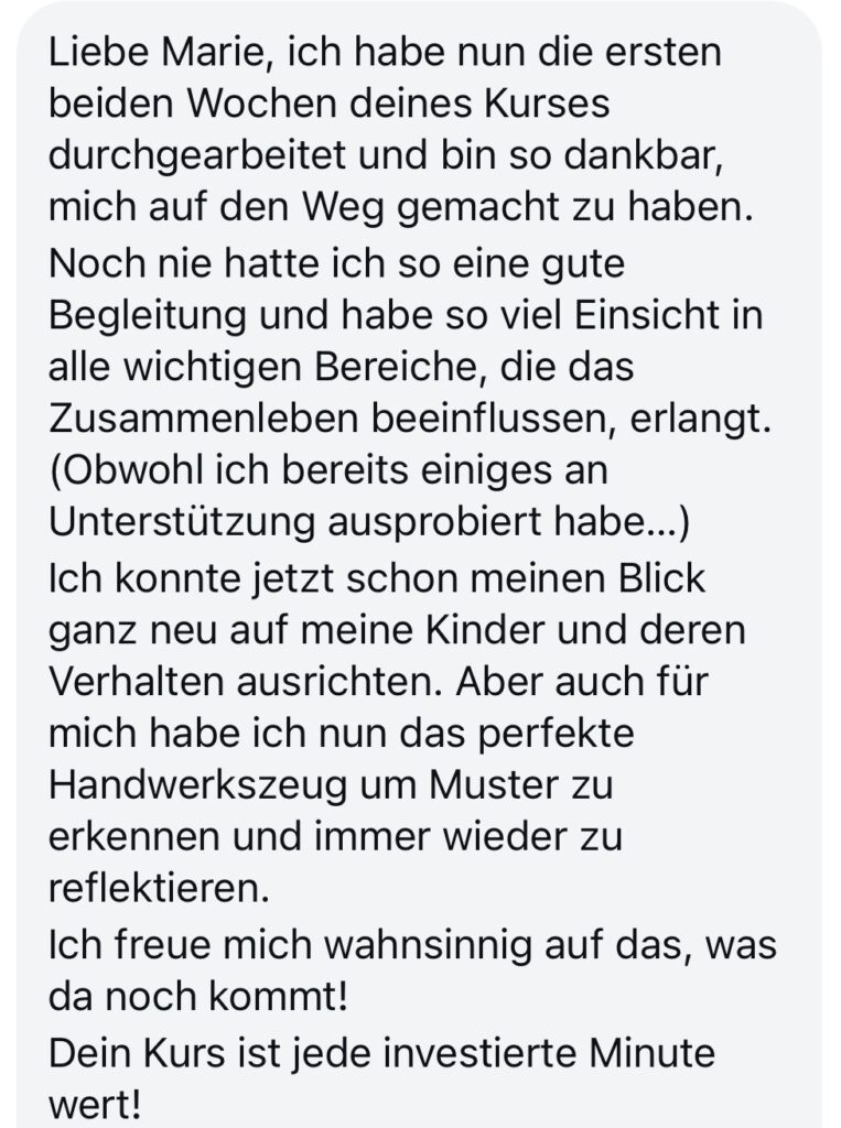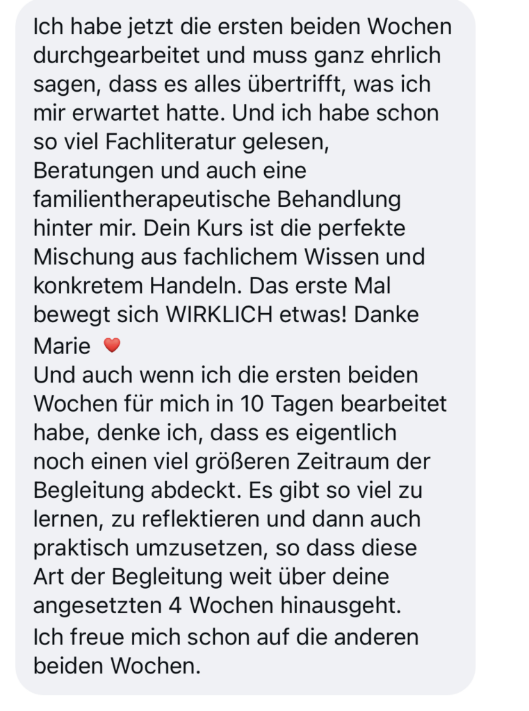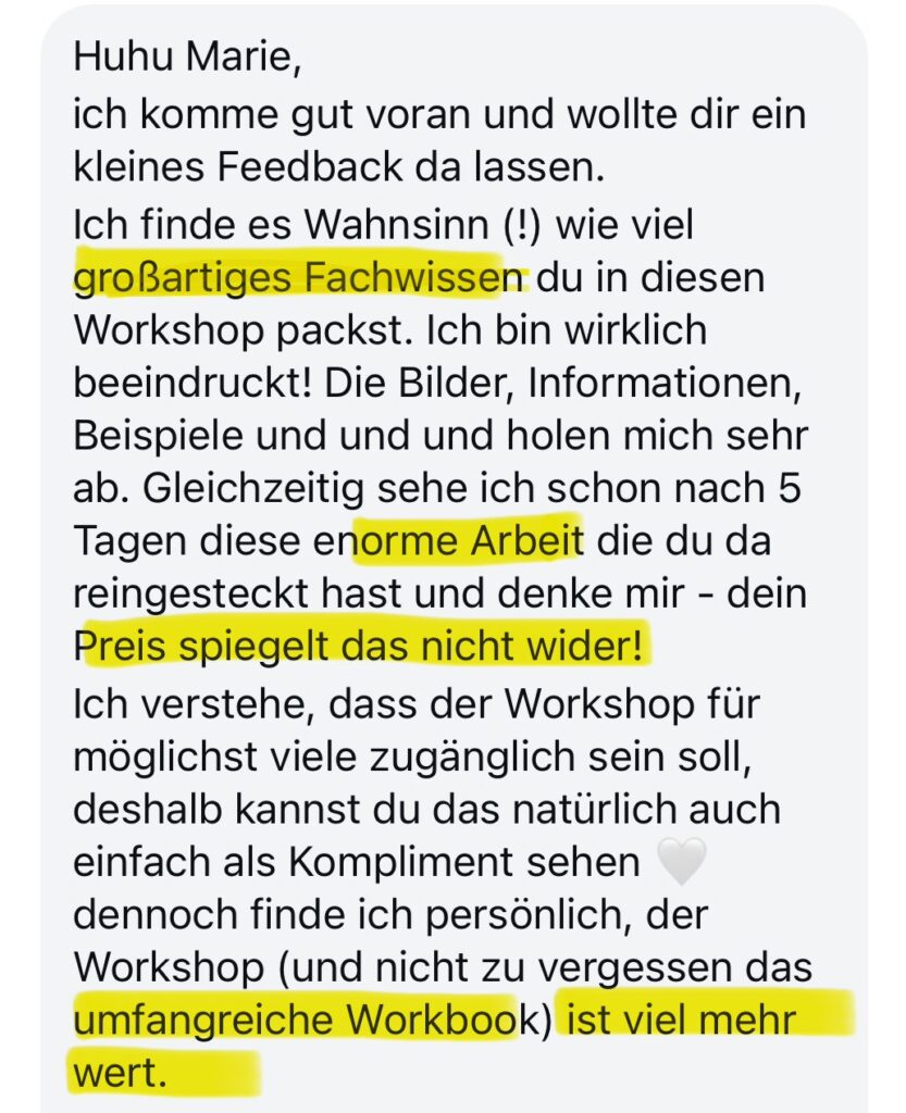Ich habe mir einen Kurs gegönnt bei dir, bin wirklich begeistert (…) man merkt nicht nur am Preis-Leistungsverhältnis wie du anderen Menschen helfen möchtest, sondern auch mit wie viel Mühe dein Kurs aufgebaut ist, wie viel Herz und Ehrlichkeit darin stecken (…), ich meine ehrlich wo gibt es sowas für das was man bekommt? Unglaublich, danke dafür erstmal!!✨💖